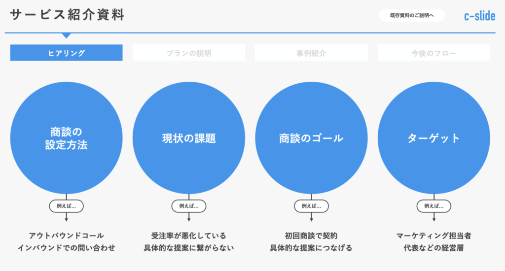 なので、サービス紹介や、事例紹介等はもちろん資料内に入れつつ、ヒアリング項目の用意や、クライアントが抱える課題のページを用意しておき、どんなクライアントがきても同じクオリティの商談ができるような体制を資料を使って整えておきましょう。