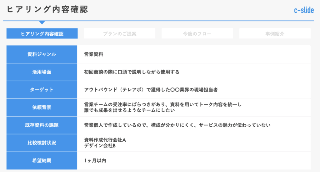 これをすることで、ヒアリングで何を聞けば良いか分からなくなるといった悩みや、課題の提示が難しいケースもある程度は解決することができます。