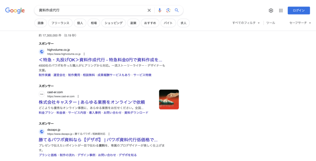 上記は「資料作成代行」の検索結果で、スポンサーと表示されているサイトがリスティング広告を出稿している企業です。