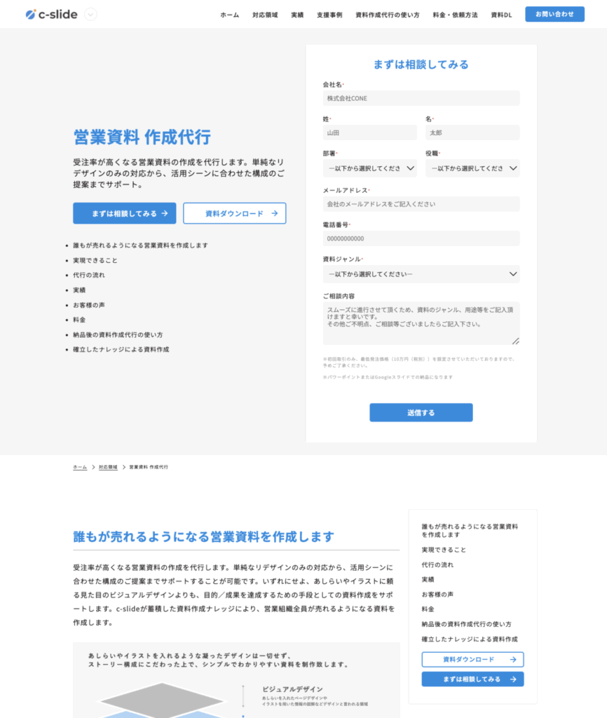 その中の「営業資料 作成代行」に内容を調整したサービスページです。