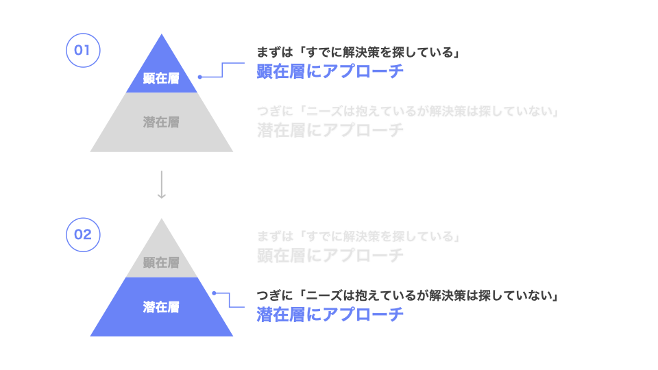 そこで意識したいのが、取り組む施策の「順番」です。まずは「すでに解決策を探している」顕在層。つぎに「ニーズは抱えているが解決策は探していない」潜在層です。
