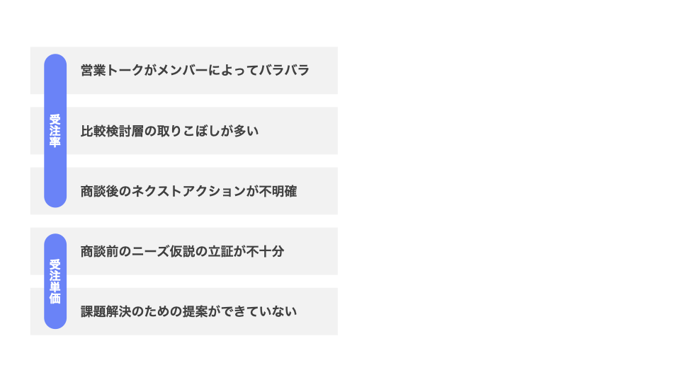 このように顧客の流入経路や獲得チャネルから「受注率を上げるための要素仮説」を立て、営業メンバーの商談内容から検証を行うことが重要です。