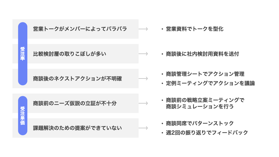 ただ数字を見るだけでは本質的な課題を見つけることはできないため、営業メンバーの商談への同席や各メンバーへのヒアリングを通して課題を明確にしていきました。