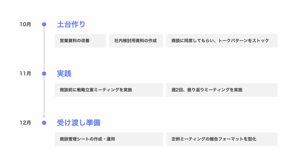 - 商談前に戦略立案ミーティングを実施し、商談シミュレーションを行う