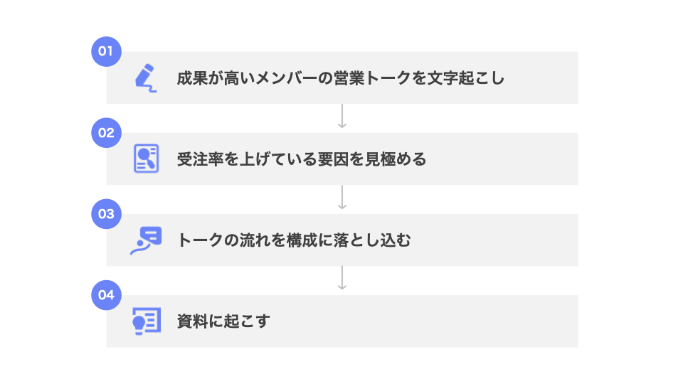 トークを構成に落とし込む段階では、トップメンバーのトークの流れを参考にしながら、受注率を上げるための要因を落とし込むことが大切です。