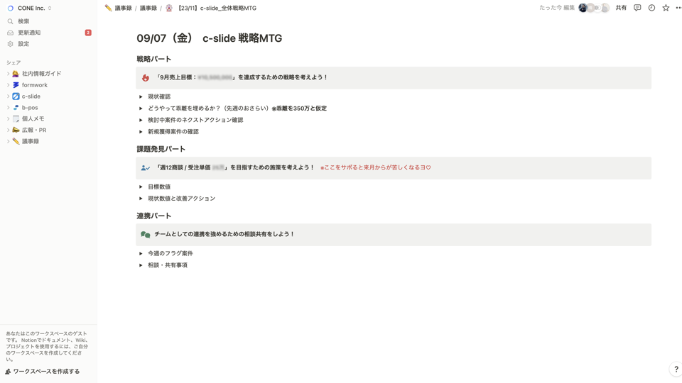 そのため、「壁打たれミーティング」という名の戦略立案ミーティングを毎日朝イチに実施していました。この時間のゴールは質の高い提案ができるよう、各企業のニーズの仮説を立てることができている状態です。このゴールを達成するために以下のアジェンダで進めていました。