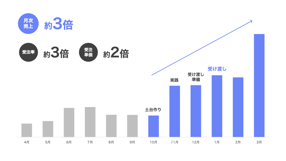 ところが「売上が上がるどころか、下がる」という大きな課題に直面し、営業組織の抜本的な改善が必要になりました。様々な施策を実施した結果、月次売上は3倍以上に成長し、事業を拡大することができました。
