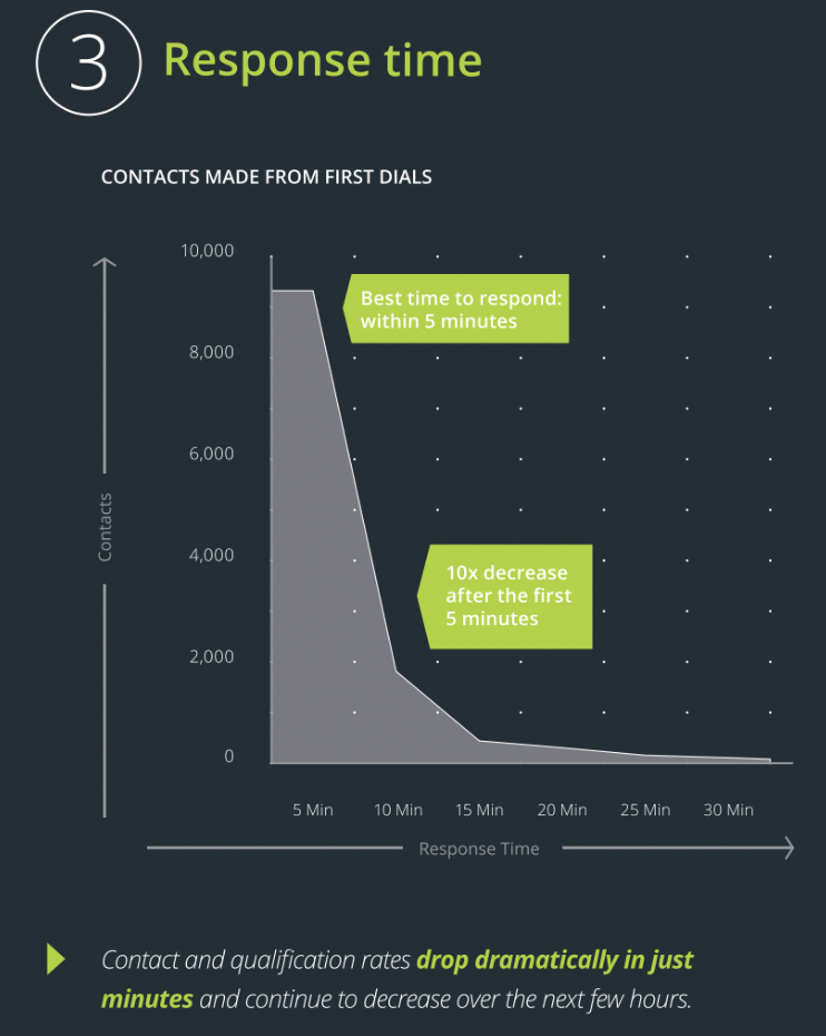 また、けっこう擦られているデータではございますが、実際の調査でも5分以内に架電をすると、10分以内の架電に比べて着電率が4倍も違うそうです。