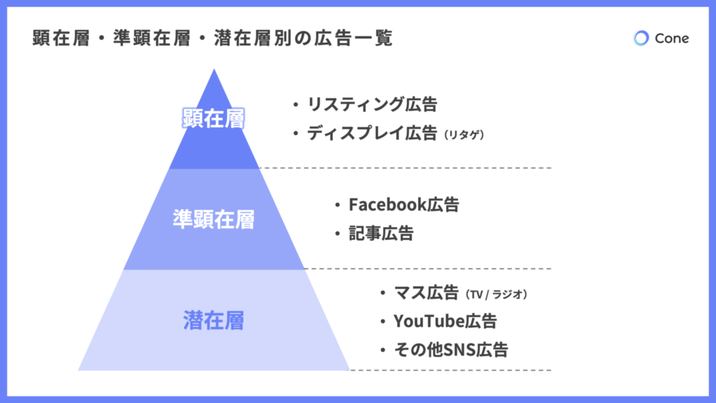 リスティング広告は「今解決策を探している顕在層ユーザーにリーチできる広告」でした。リスティング広告である程度結果が出始め、導入事例が拡充できてきたら、より多くの見込み顧客へリーチするために媒体を拡張していきます。ざっくりとしたターゲット別の広告一覧は以下のとおりです。
