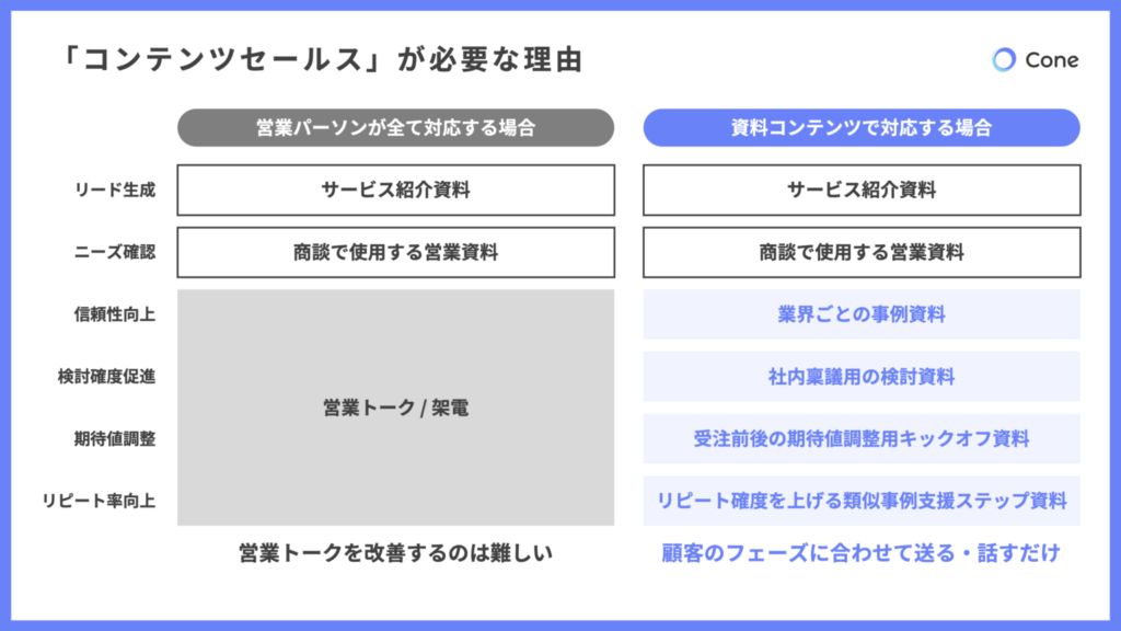 Coneでは、コンテンツセールス(資料を活用した営業パーソンに頼らない効率の良い営業手法)やコンテンツマーケティング(記事・資料などのコンテンツを公開することで問い合わせを獲得する手法)を提供しています。