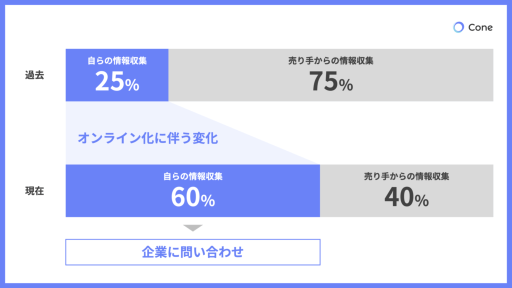 いわゆるDX化、社会のオンラインシフトによりオンライン商談やWebでの情報収集が当たり前になってきました。Web上で情報にアクセスしやすくなった結果、比較検討を行う企業の導入担当者は購買行動の60%以上を済ませてから企業に問い合わせるといわれています。