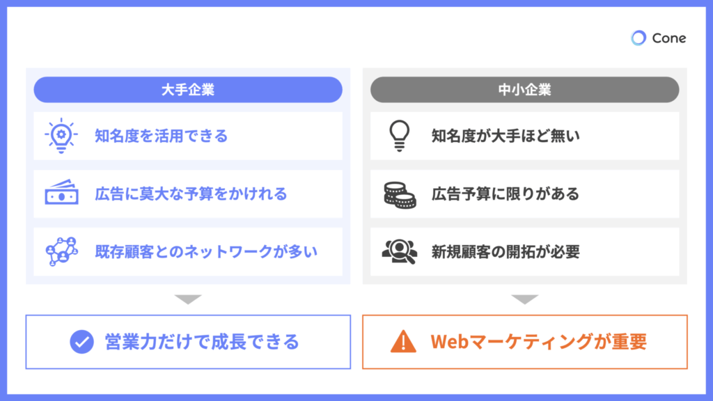 BtoB商材を扱う企業だっとしても、大手企業なら「知名度を活用した営業活動」や「莫大な予算を使ったマス広告投資」などによって新規顧客獲得ができますが、中小企業はリソースが限られているため、大手企業よりも中小企業のほうがWebマーケティング導入の重要性が高いと言えます。