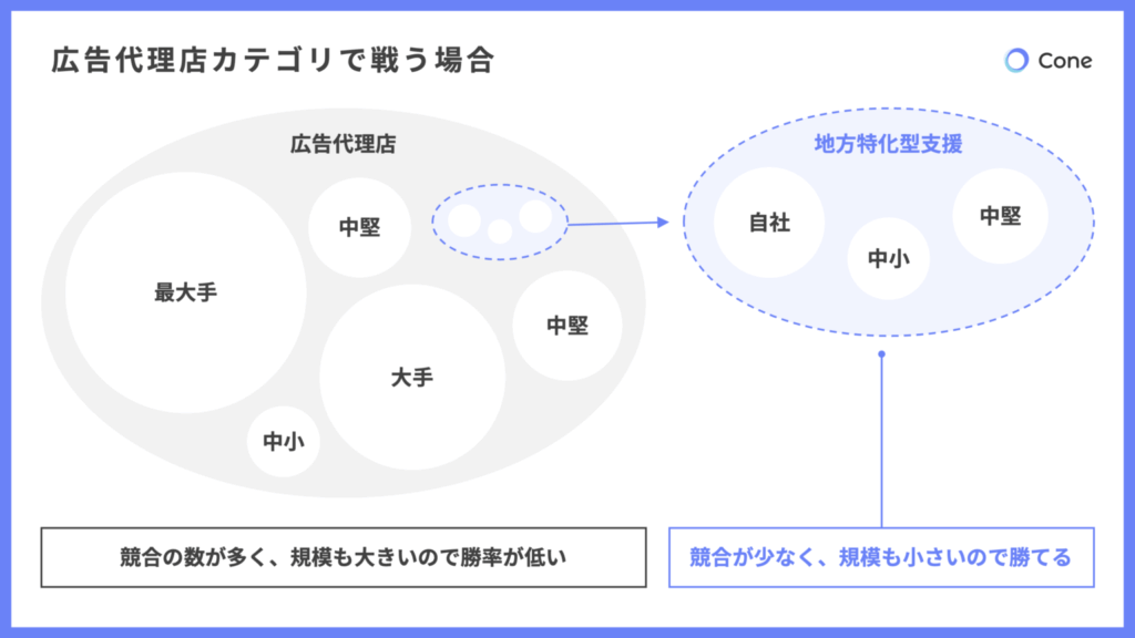 中小企業が大手企業と同じように戦っていては勝てません。たとえば、自社が広告代理店で企業の広告運用やコピーの作成などを請負う会社だったとして自社を「広告代理店」というカテゴリに分類してしまうと競合は「電通」や「博報堂」などになってしまいます。戦う競合の「数」と「質」が大きすぎると自社が獲得できる顧客数と勝率が小さくなってしまいます。