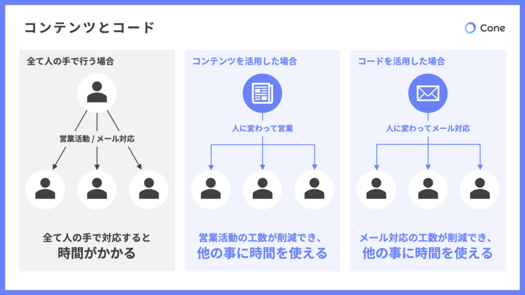 つまり、中小企業は人数と予算が限られているからこそ、「人」の代わりに「コンテンツ」と「コード」に働いてもらうことで、顧客獲得・業務効率化を実現し、効率的なマーケティング施策を実施する必要があるということです。