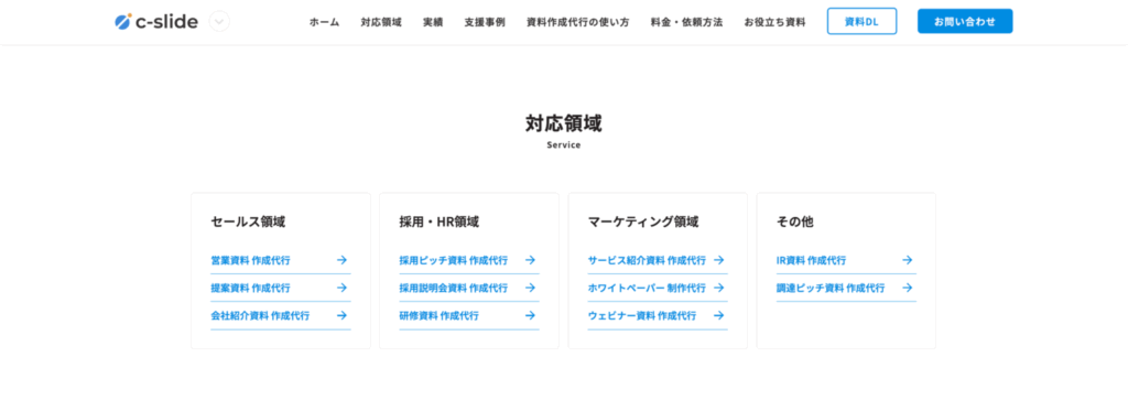 そのため、各対応領域別のサービス説明ページも用意し、顧客課題別に「できること」を説明しています。