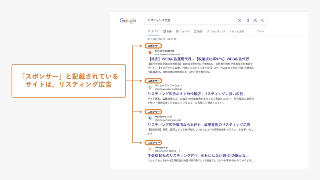 リスティング広告とは「検索連動型広告」とも呼ばれ、ユーザーが検索したキーワードの検索画面の上部に表示できる広告のこと。