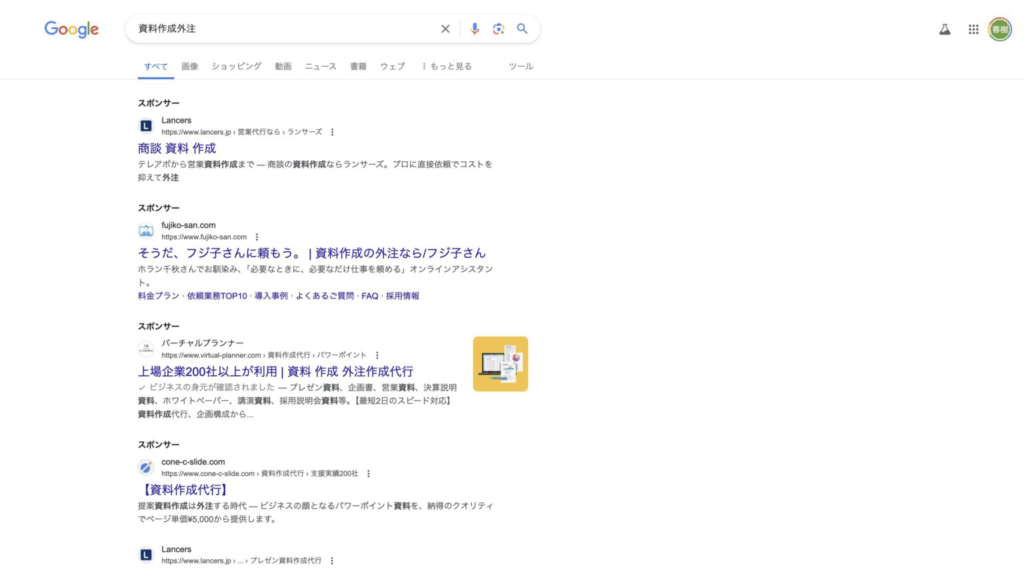 解決策を探すために入力するキーワードで自社サイトを表示することができれば、問い合わせ獲得の可能性が高くなります。たとえば、資料作成代行サービスを運営する弊社の場合だと「資料作成 外注」や「資料作成 代行 会社」などがそれに該当します。