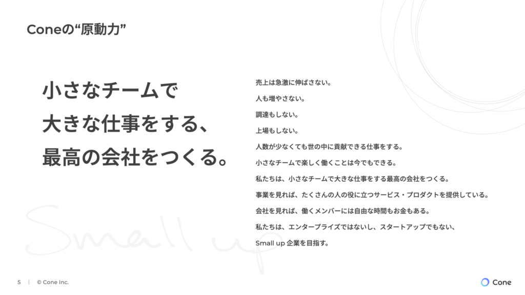 ただ今回のリニューアルの目的である「Small upという概念を知ってもらう」を達成するには、Coneという会社全体の雰囲気を知ってもらい、ビジュアルとともに概念を知ってもらうことが重要だと考え、デザイントンマナを大きく変更しました。