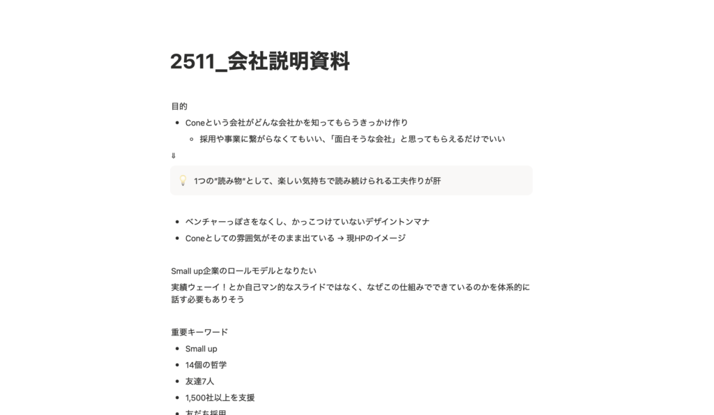 これだと本末転倒。ぼくらの想いを資料に起こしても、株式会社Coneを好きになってもらうことは到底できないと思い、資料ではなく”絵本”のようにサクサク読めて情報もしっかりと伝わるコンテンツを目指すことにしました。