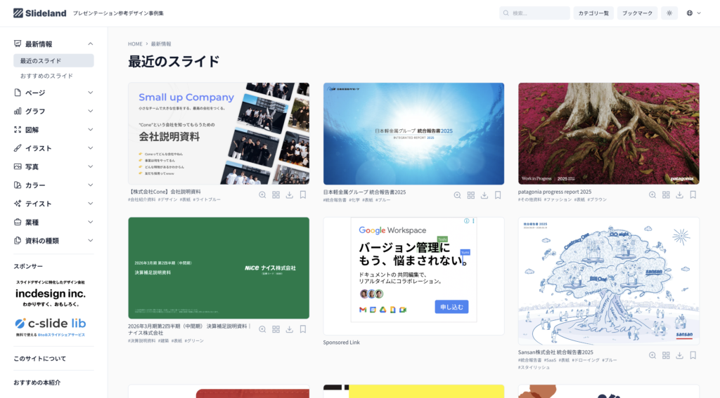ぼくらは参考デザイン探しで「Slideland」を使っています。スライドを探すだけでなく、「会社概要」「メンバー紹介」などのページからでも、「ブルー」「イエロー」などのカラーからで探すことができるのがめちゃ便利。デザイン制作時も重宝してるサイトです。