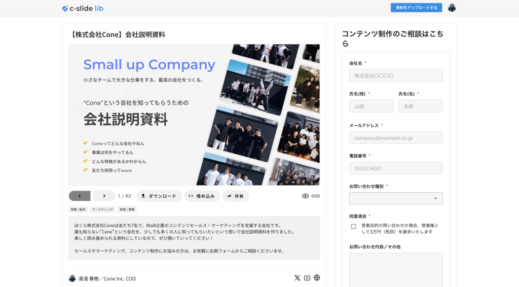 c-slide libは資料の掲載だけではなく、資料閲覧画面右側に「お問い合わせフォーム」の埋め込みが無料でできるため、「コンテンツ制作のご相談はこちら」と、資料を見た後に行動に移せる導線を確保しています。