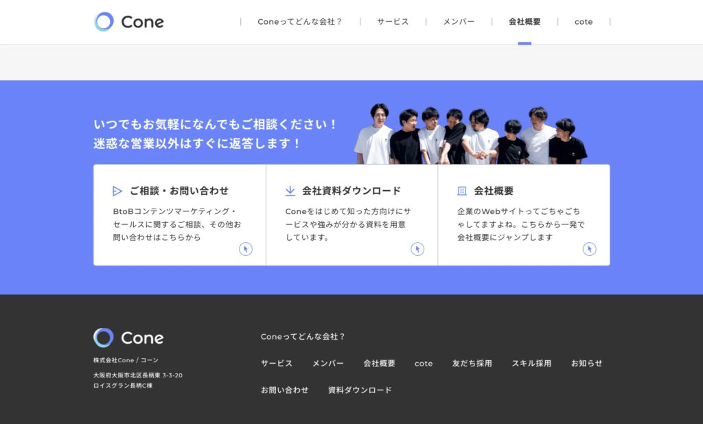 フッターは、会社の雰囲気がわかるようなメンバーの写真とテキスト。あと味噌は「会社概要」部分です。