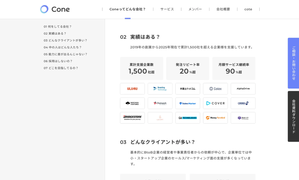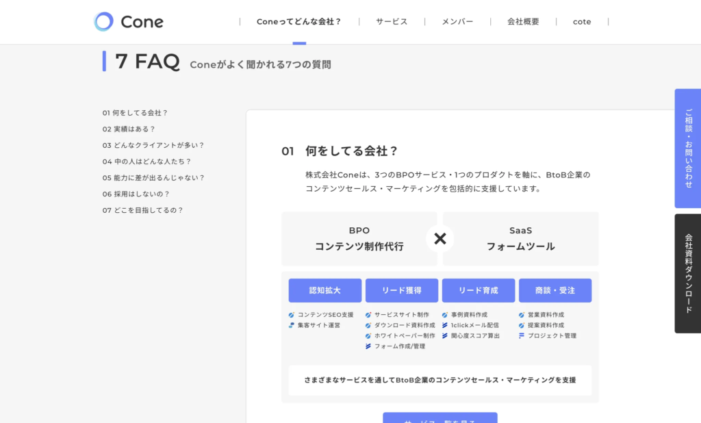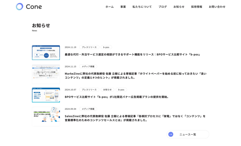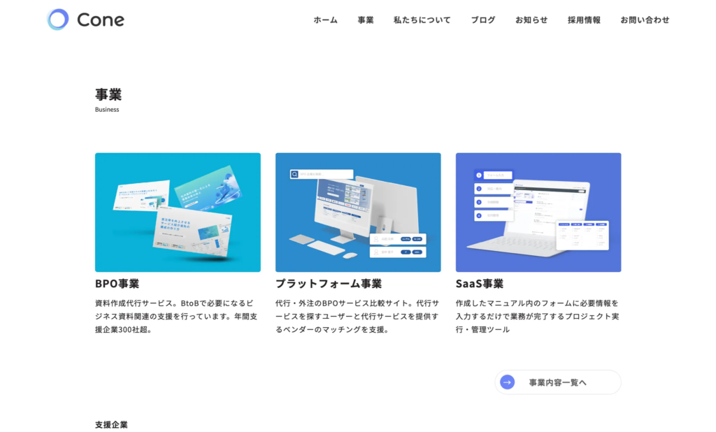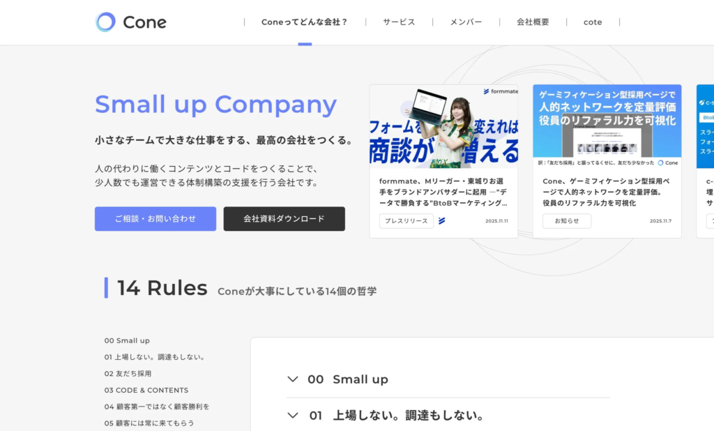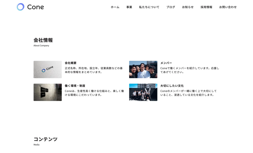 リニューアル前のConeのコーポレートサイトは、自社の知名度が限りなく低いにも関わらず、大手企業のような「サービス」「お知らせ」「採用情報」といった要素を並べた構成のサイトとなっていました。