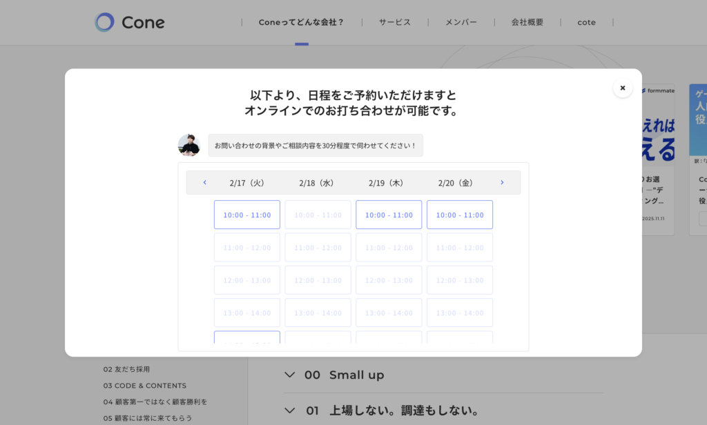 - フォーム送信後のポップアップで、営業担当のOutlookカレンダー(Microsoft カレンダー)と連携し、空き日程を表示