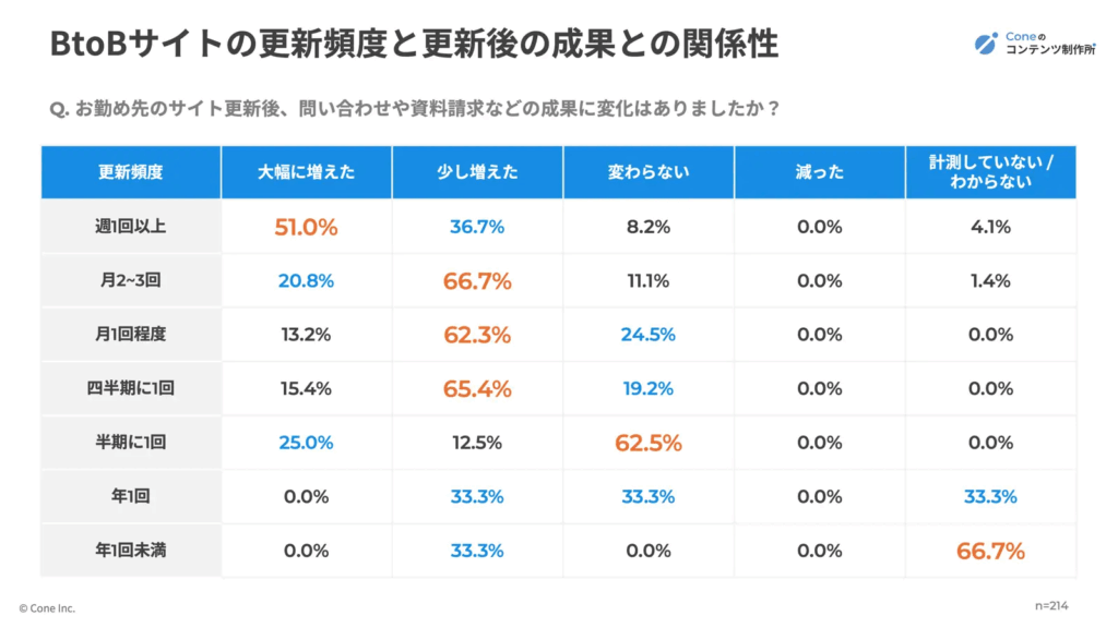 株式会社Cone(本社:大阪府大阪市、代表取締役:佐藤 立樹)は、自社のBtoBサービスサイト運営に携わる担当者を対象に、「サイトの更新頻度と成果の関係性」に関する調査を実施しました。