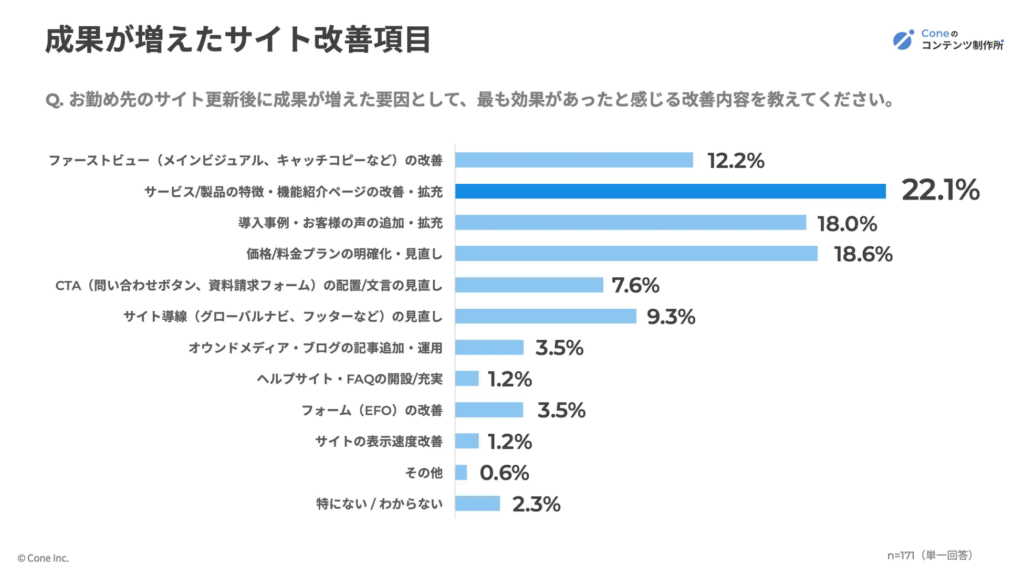 成果が増加した要因として最も効果があった改善内容は、「サービス/製品の特徴・機能紹介ページの改善・拡充」(22.1%)、「価格/料金プランの明確化・見直し」(18.6%)、「導入事例・お客様の声の追加・拡充」(18.0%)に集中しました。