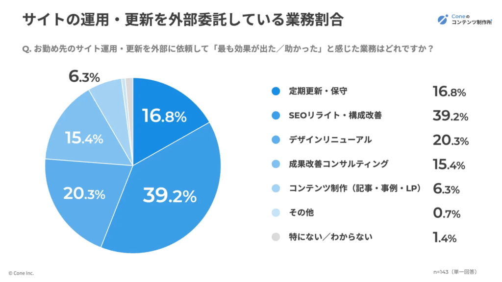 最も効果が出た業務は「SEOリライト・構成改善」で39.2%となり、次に「デザインリニューアル」(20.3%)が続きました 。一方で、「定期更新・保守」は16.8%に留まっています。